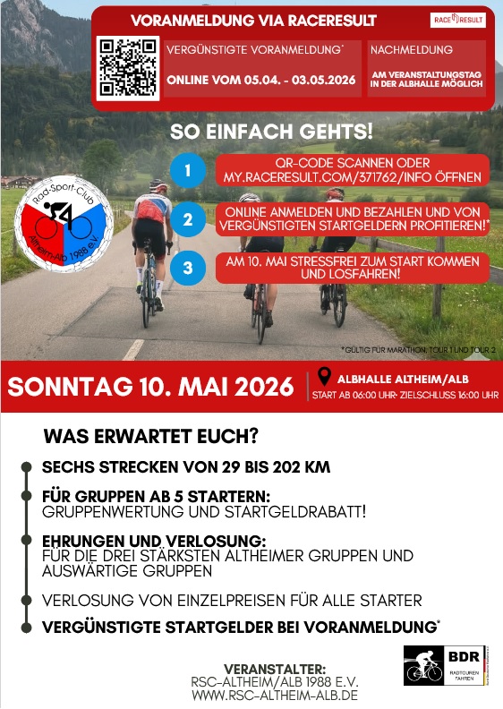 Am Samstagnachmittag, je nach Interesse: gemeinsame Radausfahrt in der großen Gruppe. Zusätzlich besuchen wir verschiedene RTFs und treffen uns zu individuellen Ausfahrten z.B. ins Allgäu.