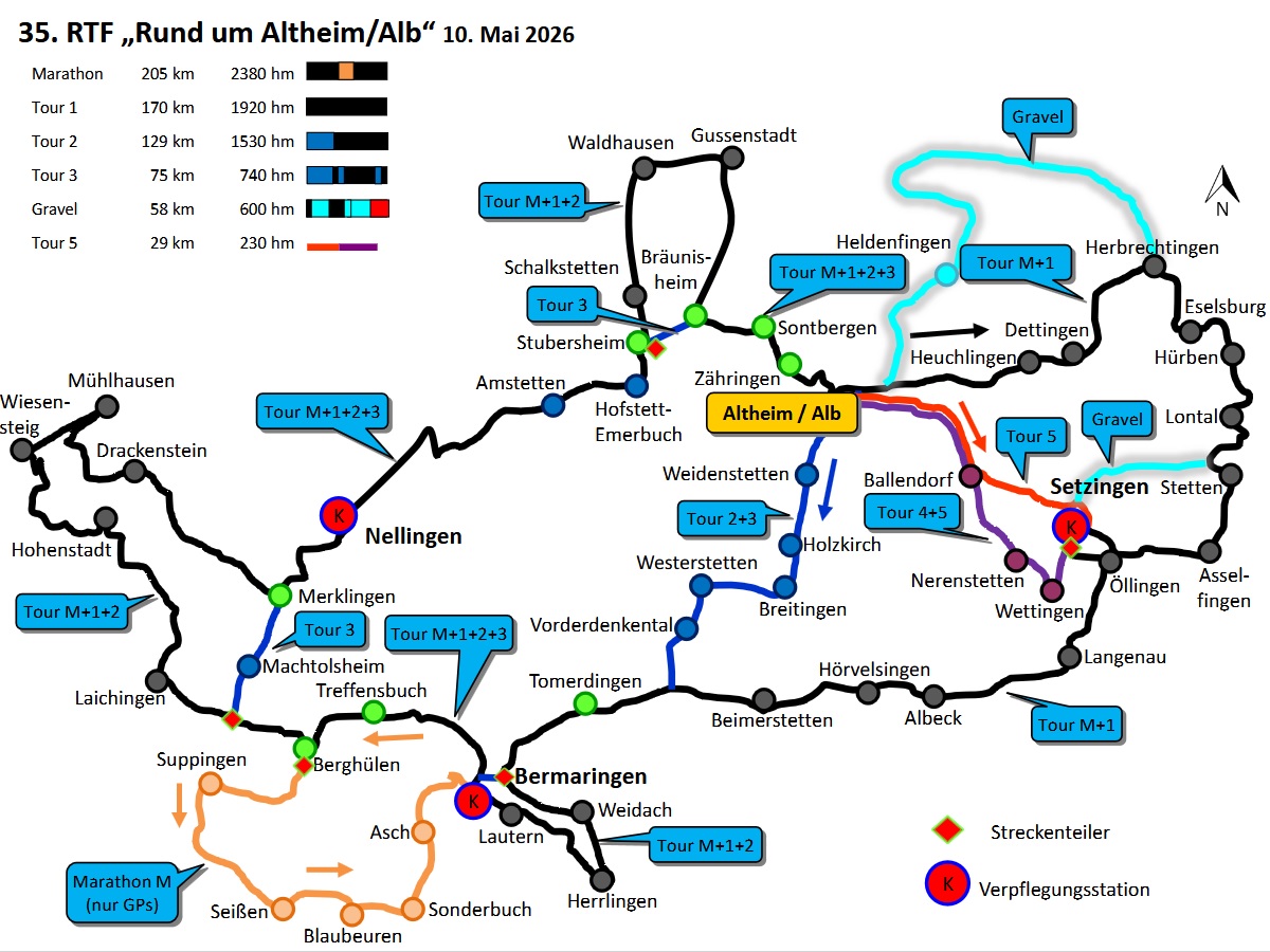 35. RTF Rund um Altheim / Alb 2026 Streckenübersicht